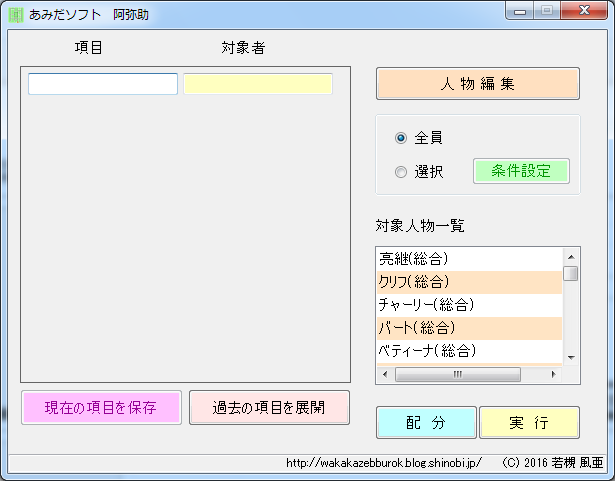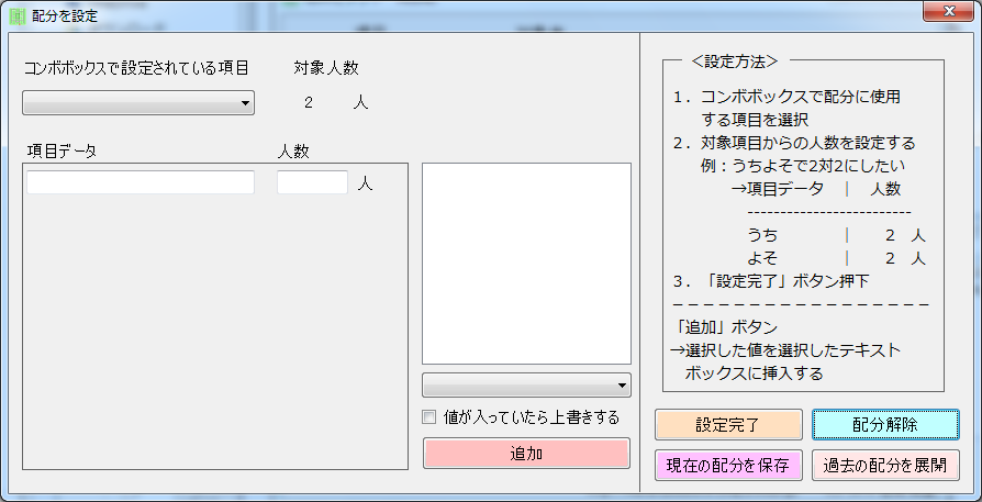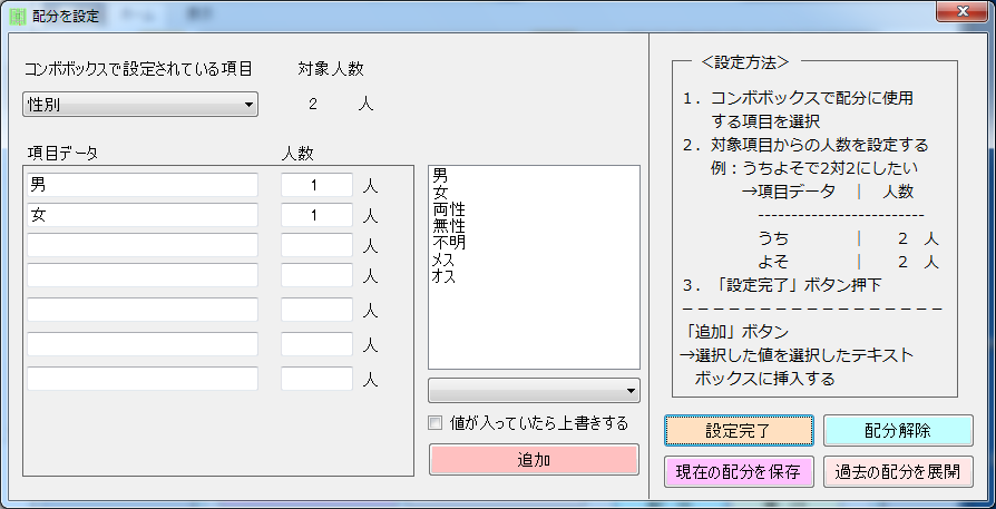 6)「配分」 = 「どの項目に含まれる人物から何人選ぶか」を設定。