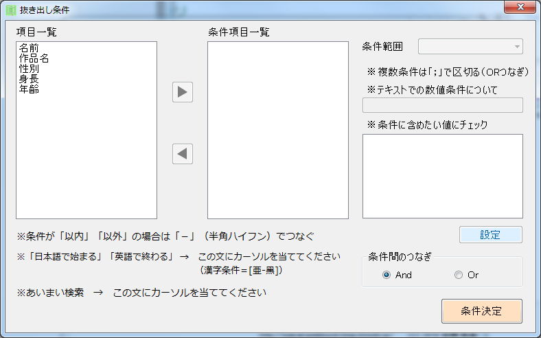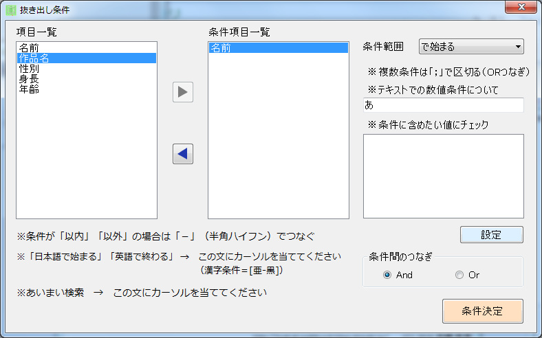 例)条件項目=「名前」、条件範囲=「で始まる」、条件内容=「あ」