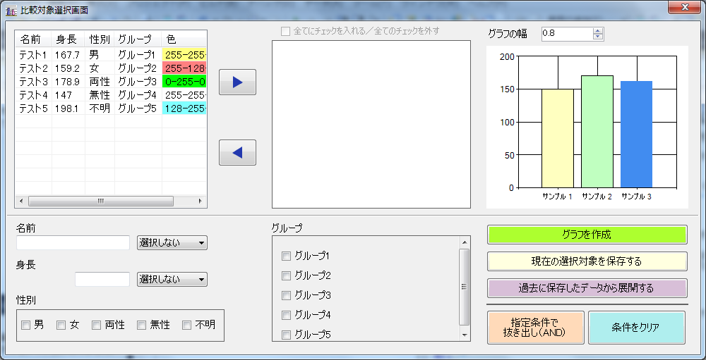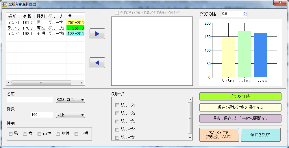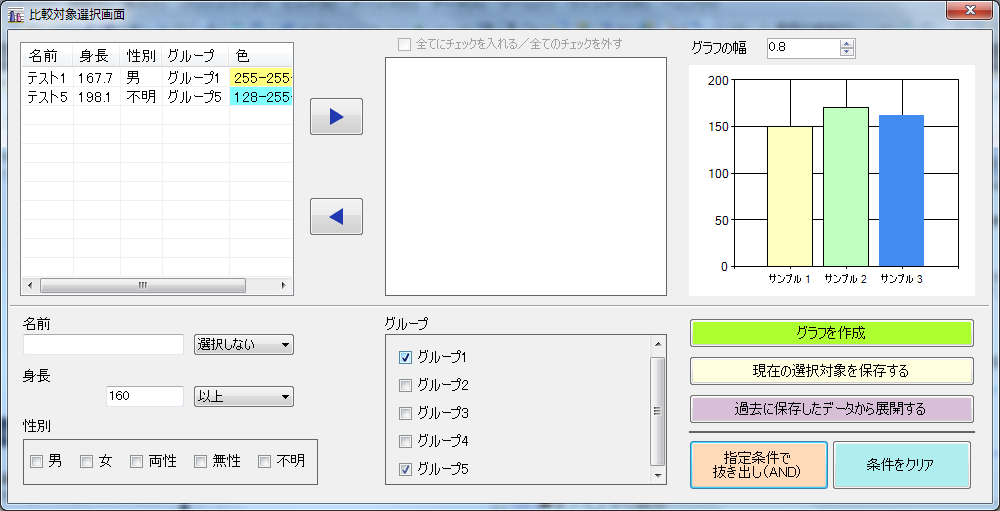 2-1.フィルタ機能 = 名前、身長、性別、グループで一覧から抜き出しが可能