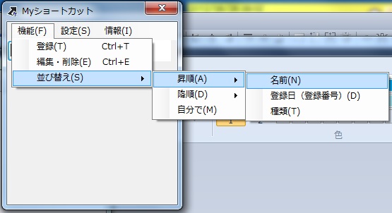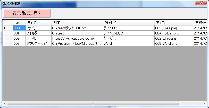 [1]昇順 : 名前、登録日(登録番号)、種類